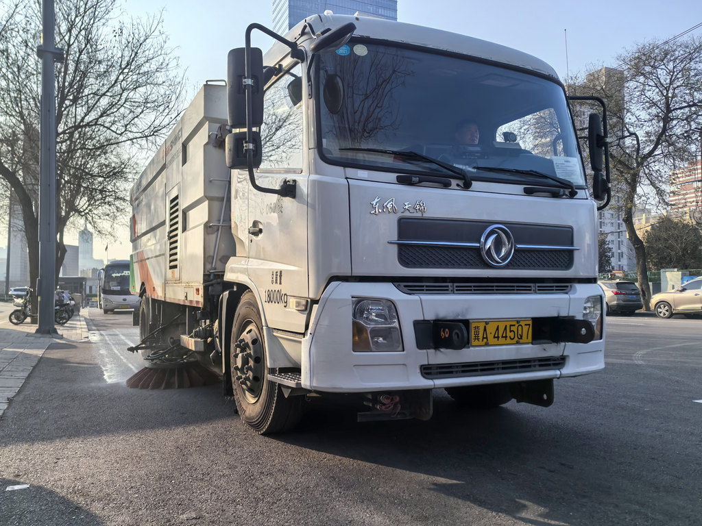 1月2日,石家庄市新华区卫生队的环卫车辆在公里街进行清扫保洁作业。