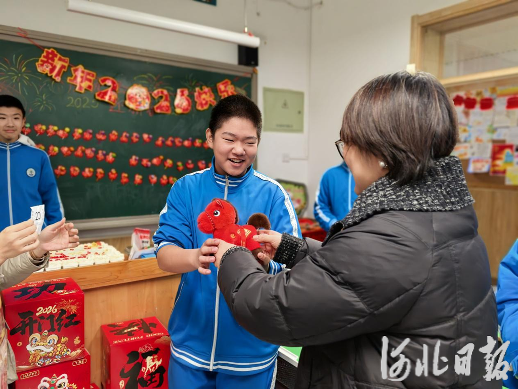 2025年12月31日,在石家庄市第二十八中学举行的“青春迎元旦,逐梦启新程”联欢会抽奖环节中,老师给学生送小红马,寓意“鸿运当头”。
