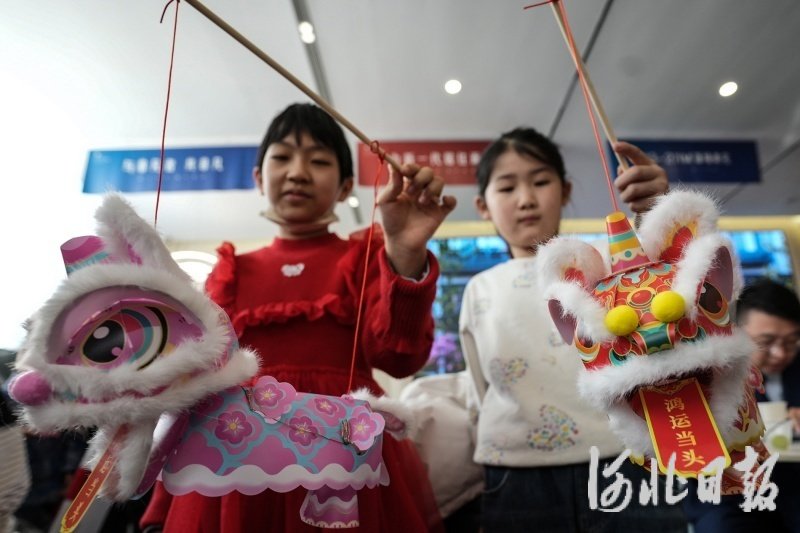 1月1日,两位小朋友在迁安金岭贰号院展示中心展示自己制作的醒狮。