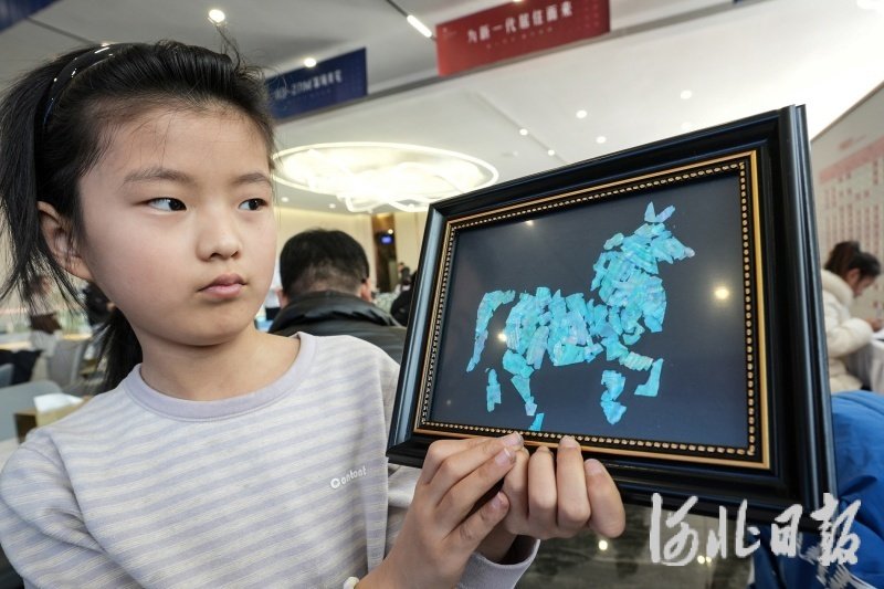 1月3日,一位小朋友在迁安金岭贰号院展示中心展示自己制作的马到成功螺钿画。