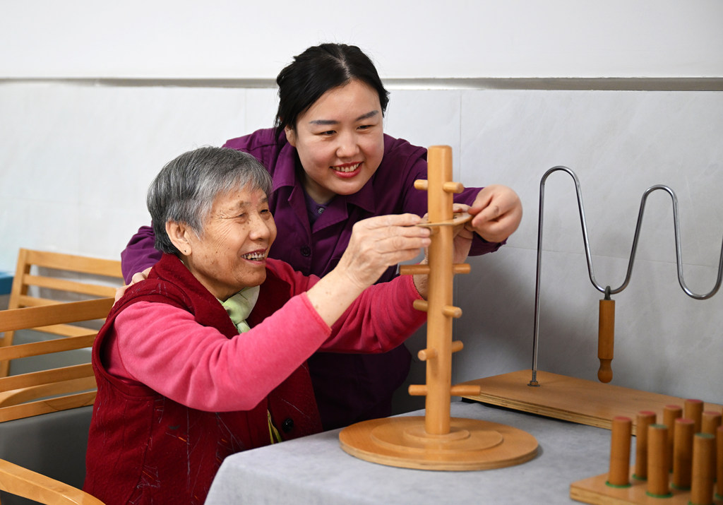 近日,邢台市南和区人民医院医养中心护理员在陪老人做益智游戏。