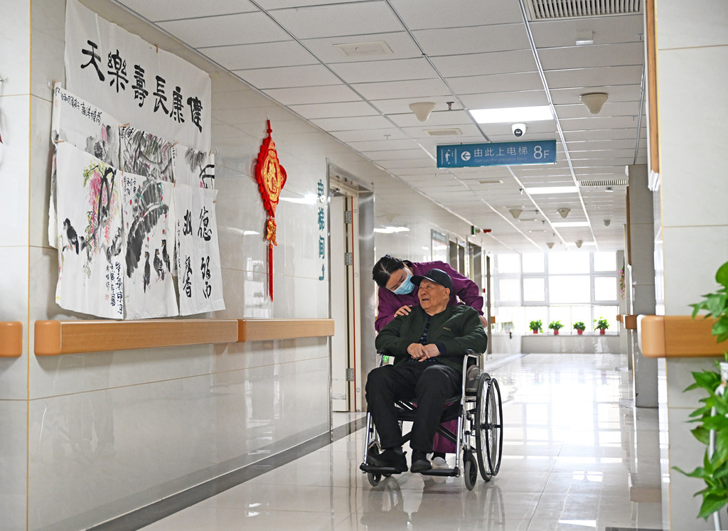 近日,邢台市南和区人民医院医养中心护理员推老人去做康复训练。