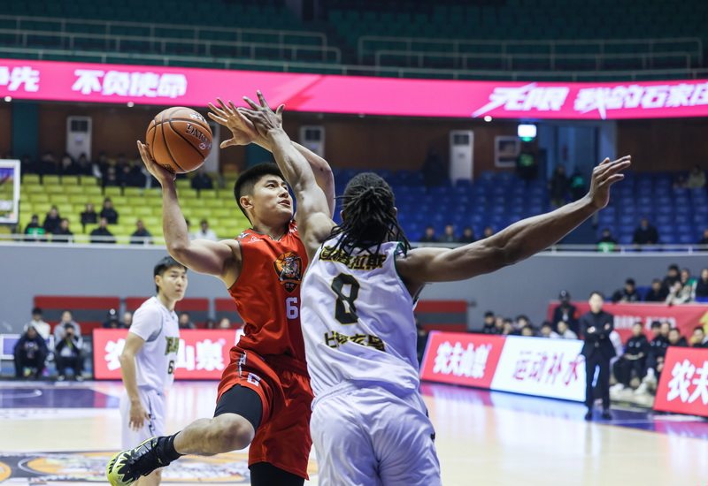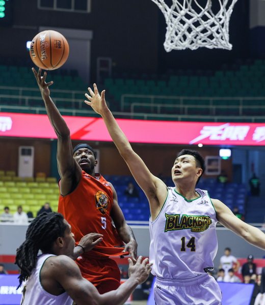 1月4日,石家庄翔蓝队外援5号黑根斯(中)在比赛中。