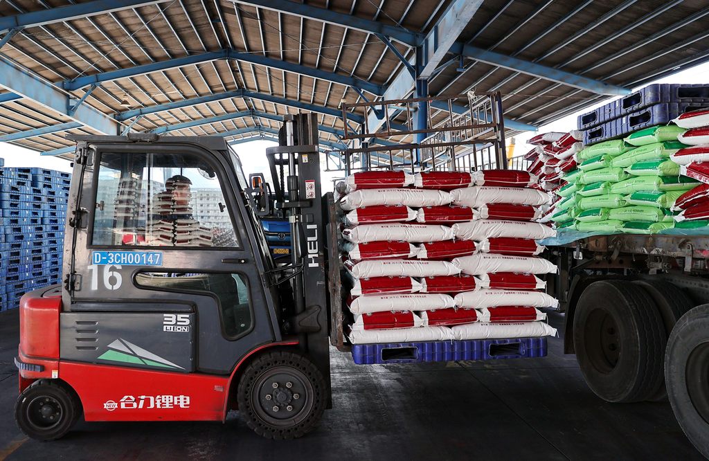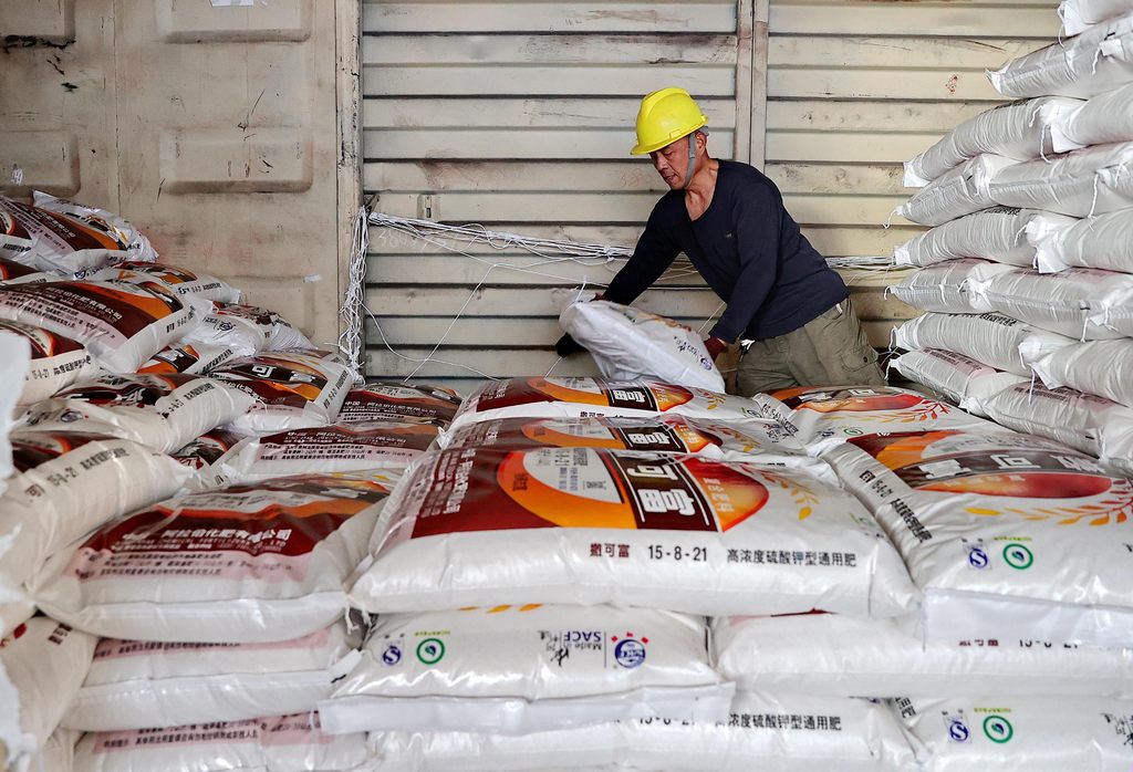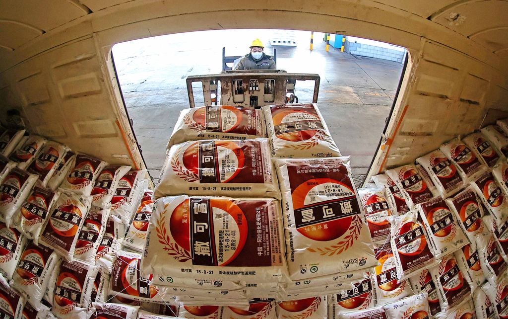 1月5日,位于秦皇岛市海港区的中国-阿拉伯化肥有限公司,工人正在装运化肥。
