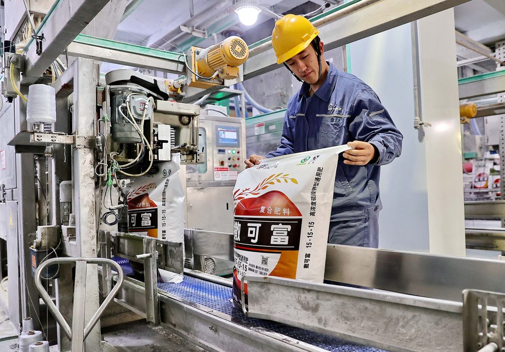 1月5日,位于秦皇岛市海港区的中国-阿拉伯化肥有限公司,工人正在化肥包装生产线工作。