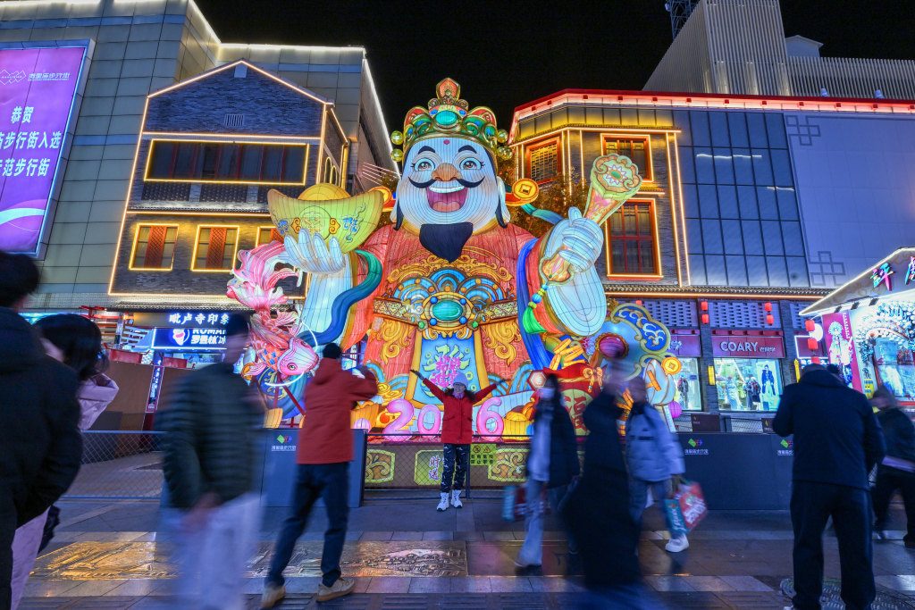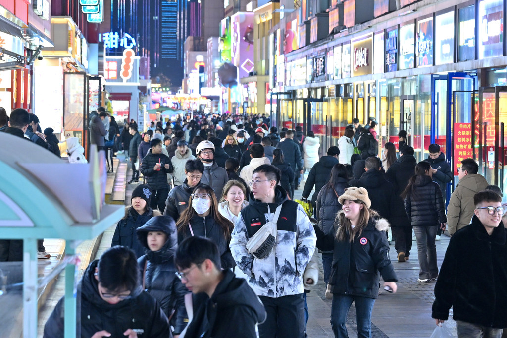 1月6日,夜幕下的石家庄市湾里庙步行街灯火璀璨,摩肩接踵的游客在光影交织中穿梭。