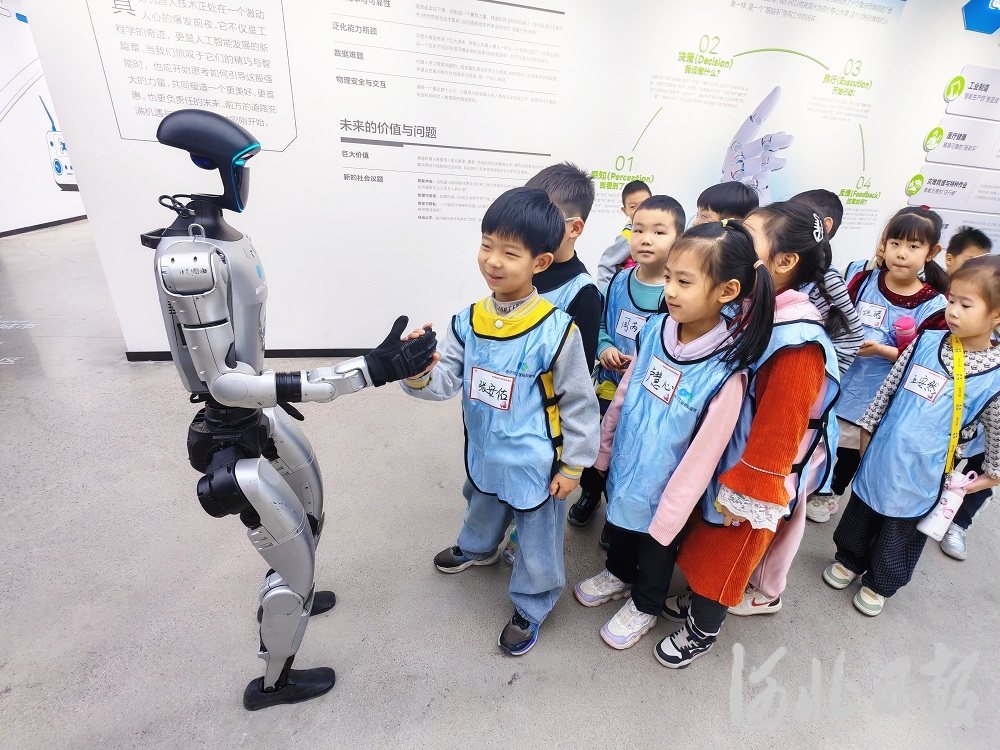 近日,在廊坊市人工智能科普馆,小朋友与机器人互动交流。河北日报记者刘杰摄