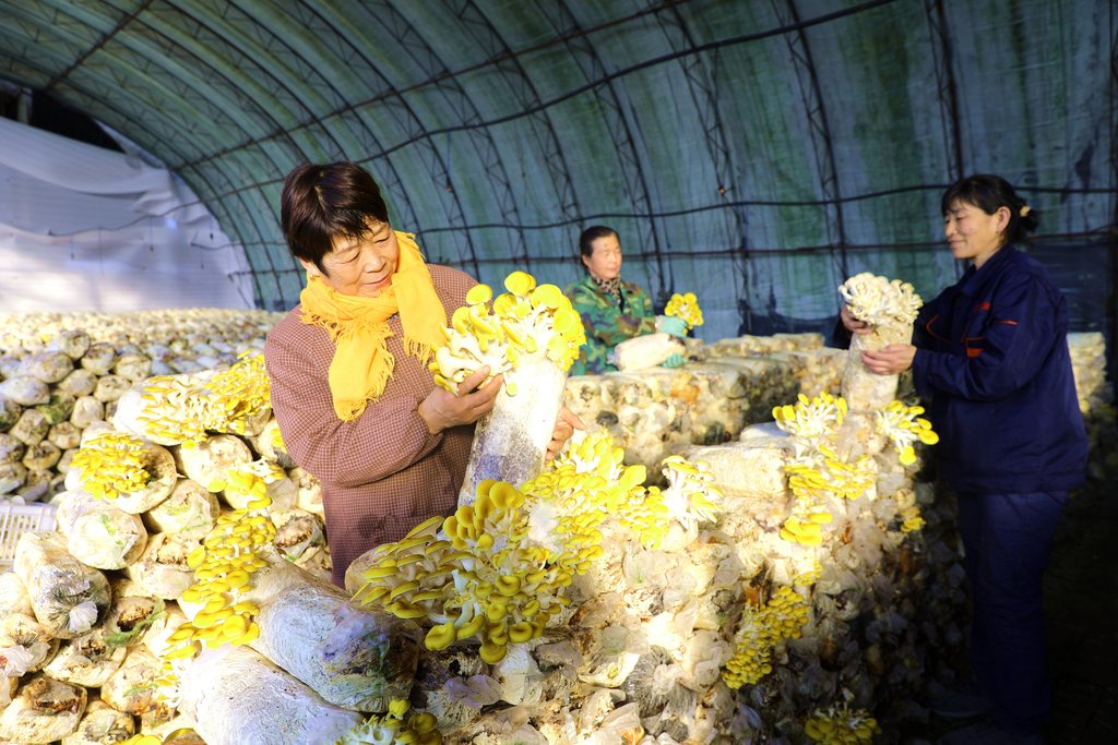 农民在种植棚内采摘榆黄蘑鲜品实现增收。
