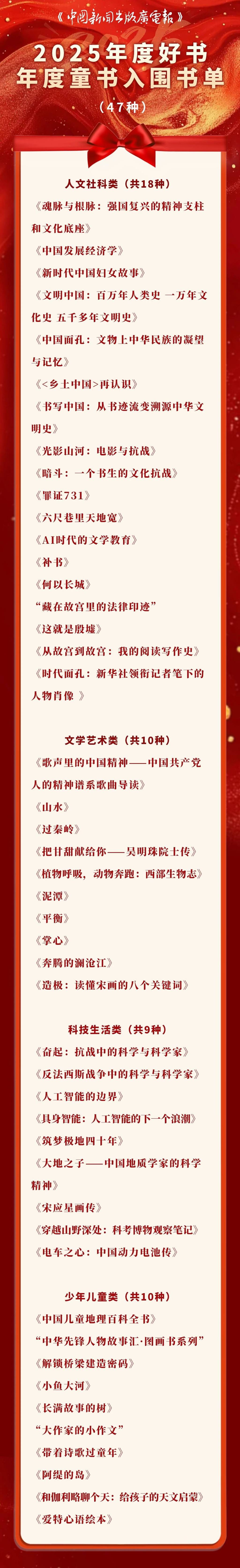 历史长卷、文明探究、科学洞察、哲学深思、人性洞察……好书如繁星,带领我们穿越时光与古今对话、超越日常思考生命。1月7日,《中国新闻出版广电报》2025年度好书发布仪式在北京广播大厦举行。此次活动发布了2025年度好书、年度童书101种,以及47种入围图书,吸引了出版人、作者及读者的广泛关注。