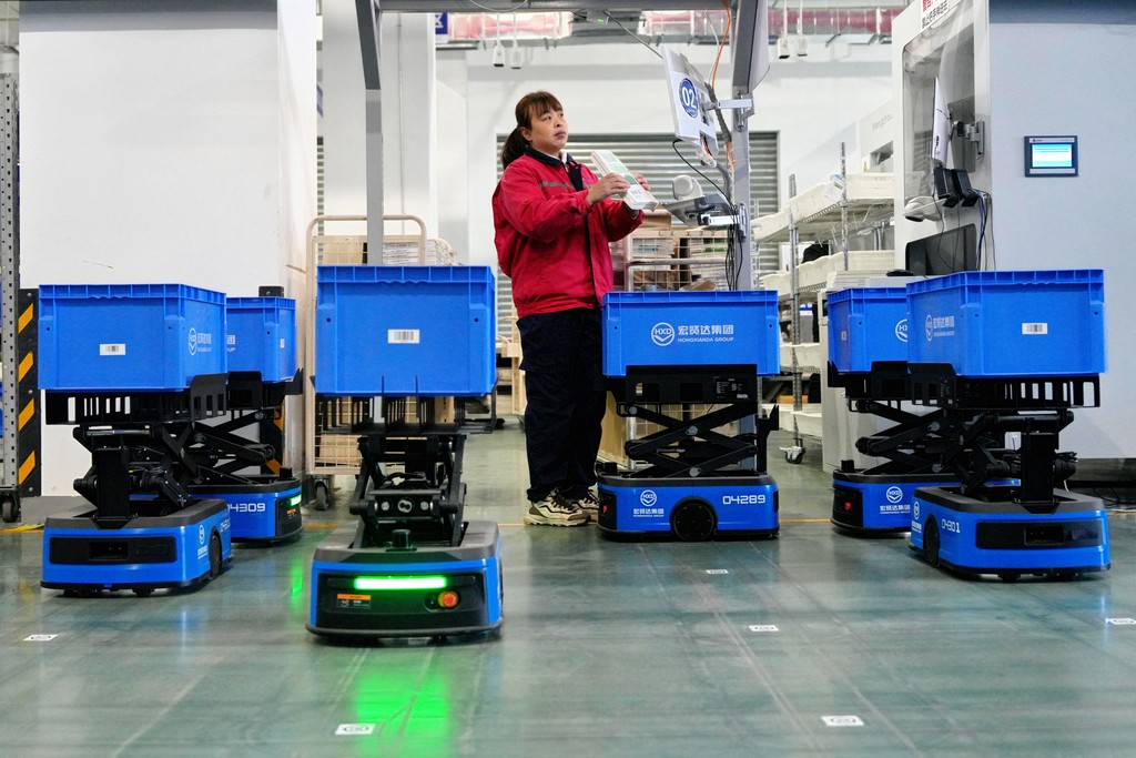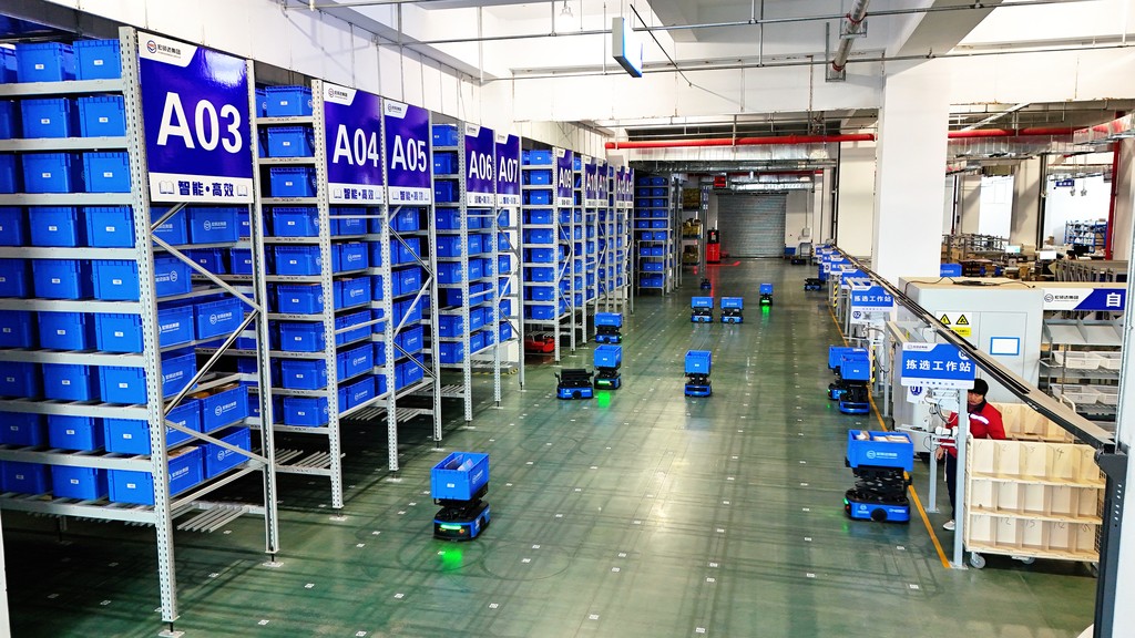 近日,智能机器人在固安县宏贤达科技集团有限公司的电商云仓内转运图书。