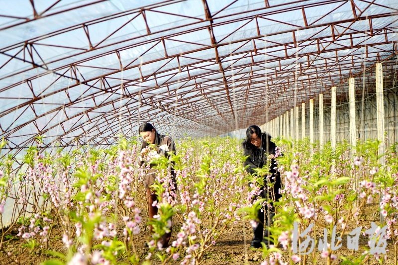 图为河北省乐亭县新寨镇桃棚内村民正在疏花。侯亚婷摄
