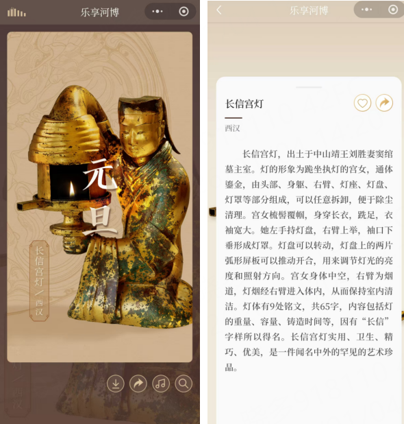 “乐享河博”小程序设置了每月主题和节庆专题,每日推送一件精选文物,内容涵盖青铜、陶瓷、书画、玉器、金银器等多个门类,系统展现河北深厚的历史文化底蕴,生动诠释中华优秀传统文化的多元一体和源远流长。通过珍贵文物的“每日陪伴”,将厚重的历史转化为每日可及的轻阅读,培养公众对历史文化的认同。用户可在“云观展”的同时,开展文物图片存储和微信分享,并同步获取河北博物院最新展览资讯。