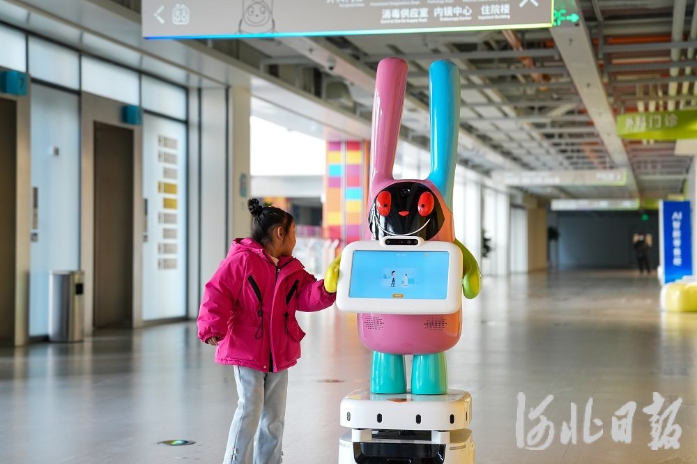 1月8日,首都医科大学附属北京儿童医院保定医院东院区门诊大厅,正在“执勤”的机器人兔子和小患者互动。
