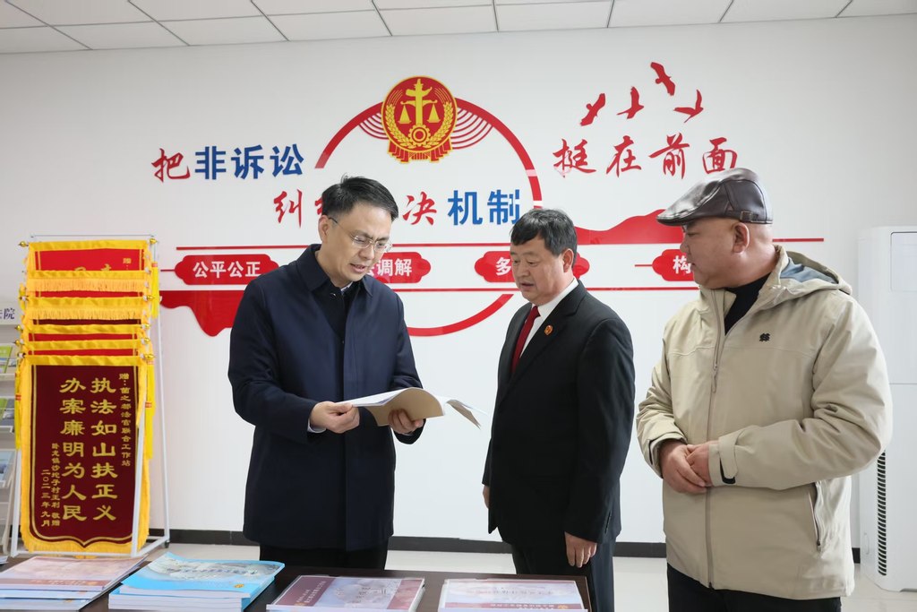 承德市中级人民法院党组书记、代院长王辉(左一)到平泉市人民法院“菌之都”法官联合工作站调研。