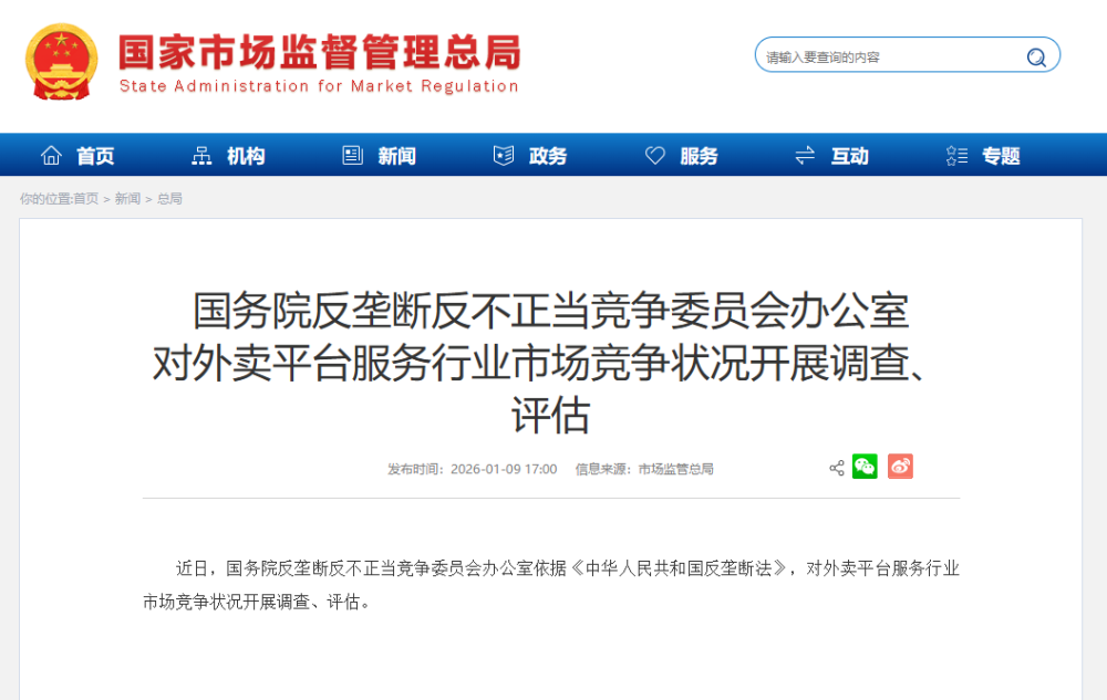 国务院反垄断反不正当竞争委员会办公室对外卖平台服务行业市场竞争状况开展调查、评估