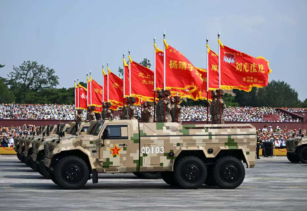 2025年9月3日上午,纪念中国人民抗日战争暨世界反法西斯战争胜利80周年阅兵式在北京天安门广场隆重举行,“刘老庄连”荣誉战旗光荣接受党和人民检阅。新华社发