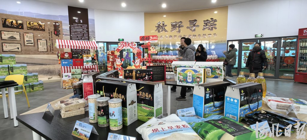 与农耕工坊连接的便是综合性游客中心,集导览、文创展示与产品销售于一体。乡村大集特产展销区里,亚麻籽油、荞麦燕麦、杂粮杂豆、牛羊肉等康保好物琳琅满目;沿大厅深入,艾草铺、萌宠屋、肉石坊、特色店等独立展室依次排列,让采风团成员直观感受到康保的特色民俗。
