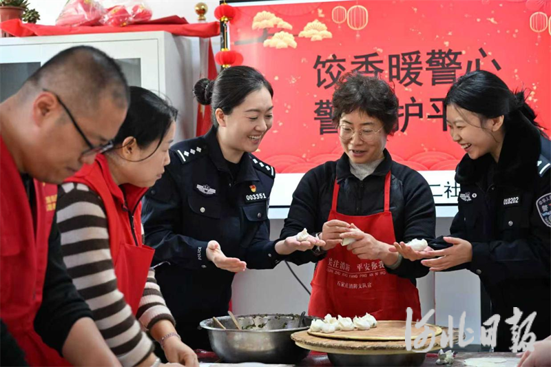 1月7日,在石家庄市新华区联盟街道高柱二社区,石家庄市公安局新华分局民警与社区工作者、居民一同包饺子。