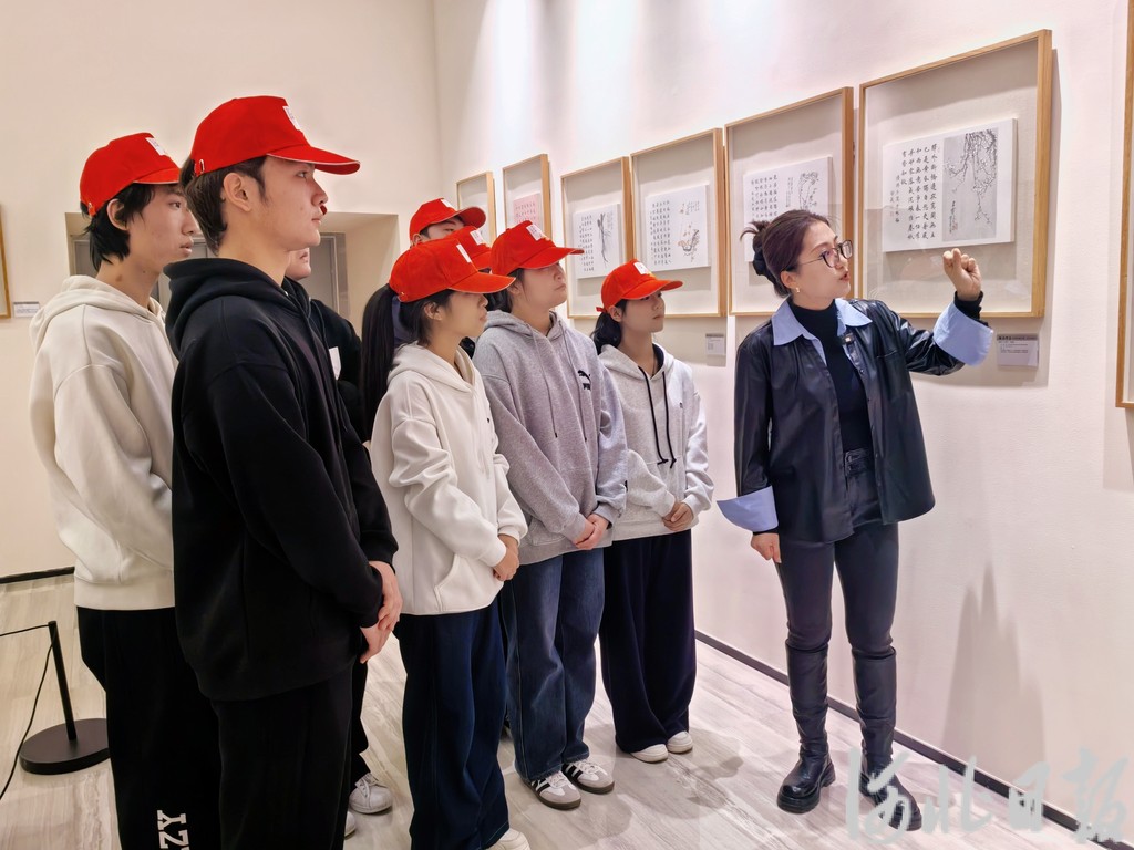 课堂上,书法教师刘统泉与学生亲切交流、循循善诱又画龙点睛,他告诉同学们欣赏一幅书法作品的技巧和方法,让学生把课堂学到的书法知识在实践中得到应用。河北科技师范学院的导览周老师,从陆启成的书法艺术特色、选纸的考究等多个方面为同学们进行了专业讲解,面对青年学子,她重点讲解了停云馆笺上那首文徵明的咏菊诗,并为同学们讲述了文徵明一生九试不第、却最终成为一代大家的经历,希望大家能从中体会到“慢而达远”的生命智慧——人生未必一路繁花,挫折与沉淀,反而能淬炼出不可替代的光芒,她带着学生一起品读张英《聪训斋语》中的句子“读书者不贱,守田者不饥,积德者不倾,择交者不败。”这十六个字,如清泉入心,传递的是贯穿一生的为人处世之道。