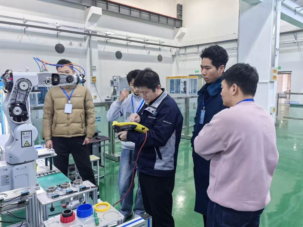 到了实训环节,21名学员分为三组,利用3台工业机器人进行实操,老师们围绕电气编程、系统调试、任务协同等模块展开教学,搭配企业技术骨干手把手指导,强化实操技能,帮助学员深入理解构造原理与数字技术应用。