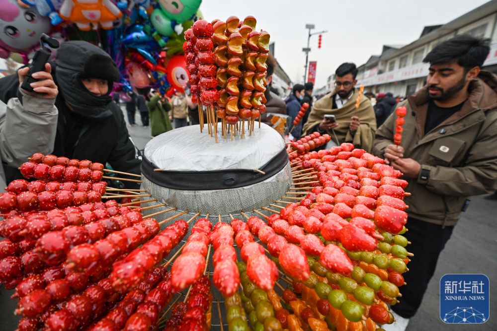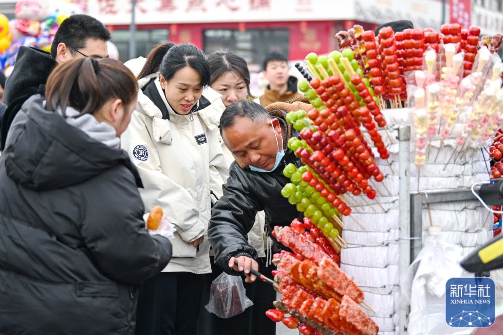 1月14日,游客在河北省元氏县南佐大集购买糖葫芦。新华社发(张晓峰摄)