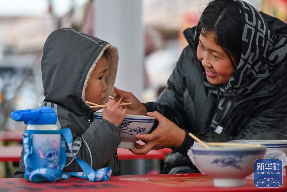 1月14日,在河北省元氏县南佐大集上,一位女士让孩子品尝地方小吃。新华社记者杨世尧摄