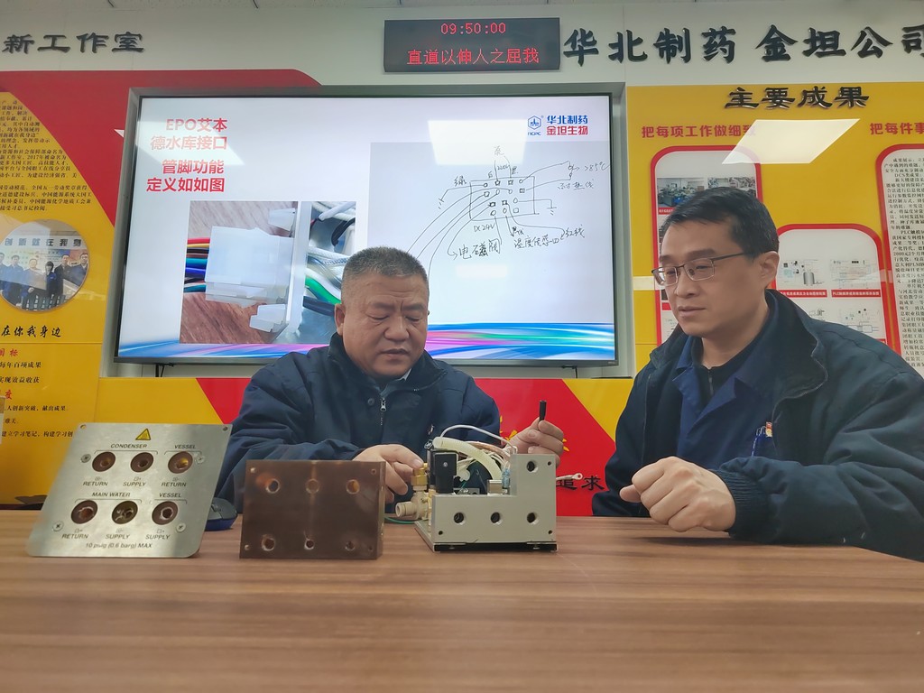 1月7日,金坦公司齐名创新工作室,桌面上摆放着一套EPO(重组人促红素)细胞培养设备水温控制核心器件,齐名正在和金坦公司设备中心机修组组长杨少华讨论器件维修改进方案。