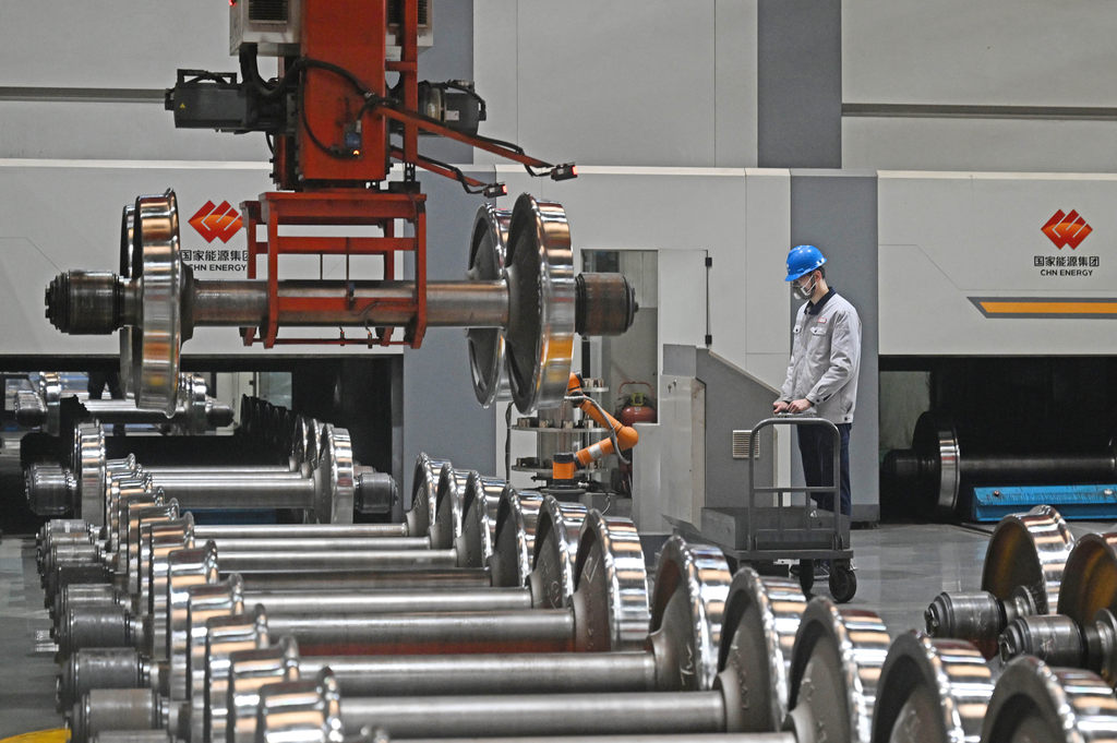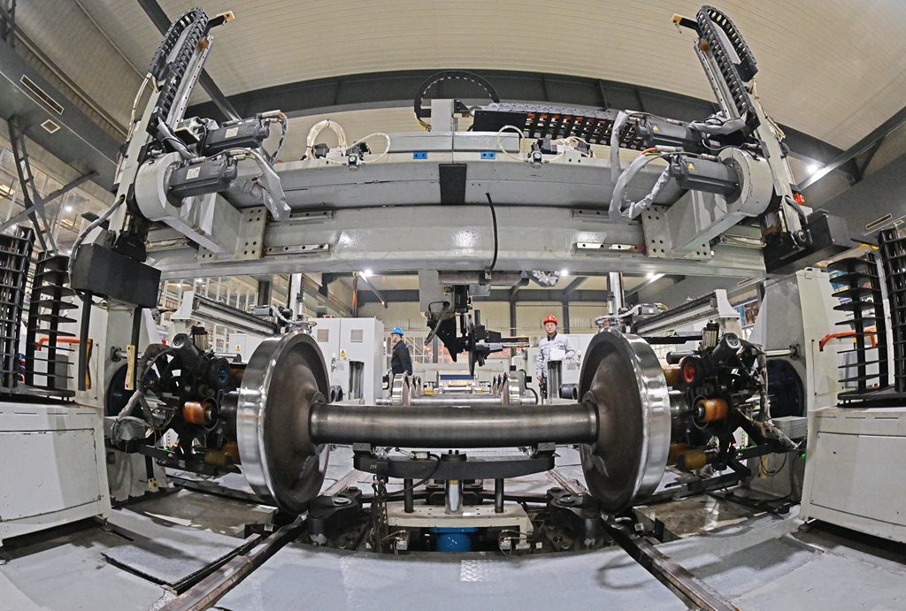 不远处,轮对轴承智能压装机正嗡嗡运转。轮对就像汽车的车轮总成,而轴承的装配精度直接影响行车安全。“这台设备能把误差控制在微米级,比头发丝还细,就像汽车4S店的精密四轮定位。”冯乐乐说。轮对和轴承压装完成的轮轴,随即被转入一旁的轮轴智能选配库。在这里,全程无需人工介入,智能系统自动调取适配轮轴,通过机械臂精准送达转向架落成工位,实现“零件找人”。