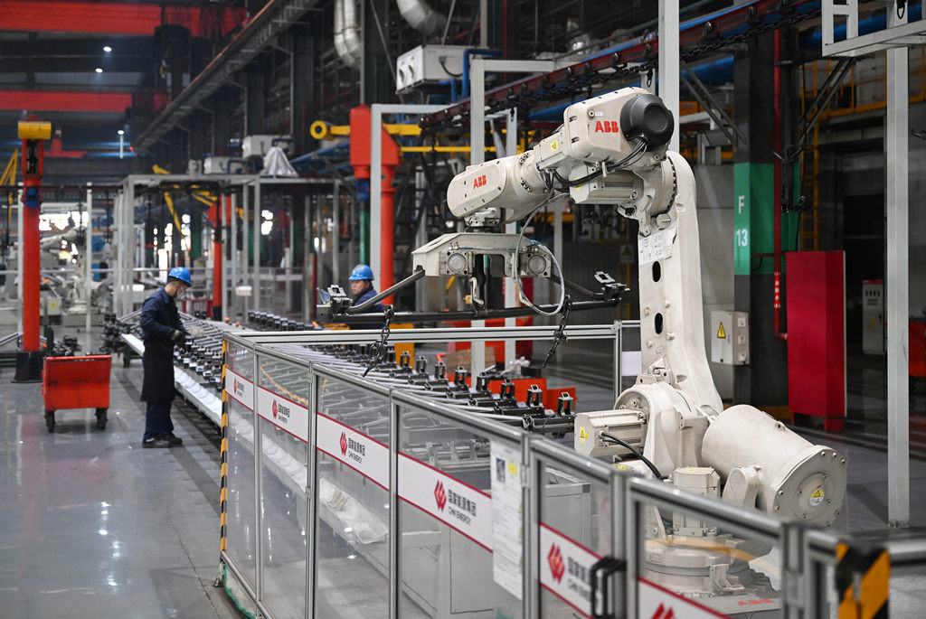 车间里,没有传统检修的人拉肩扛,取而代之的是智能装备协同作业的热闹场景。近5吨重的转向架,相当于火车的“底盘+悬挂系统”。“以前分解组装转向架,需要好几个壮汉搬运,现在一键智能操作,分分钟搞定,又快又稳!”冯乐乐指着正在作业的机械臂说。