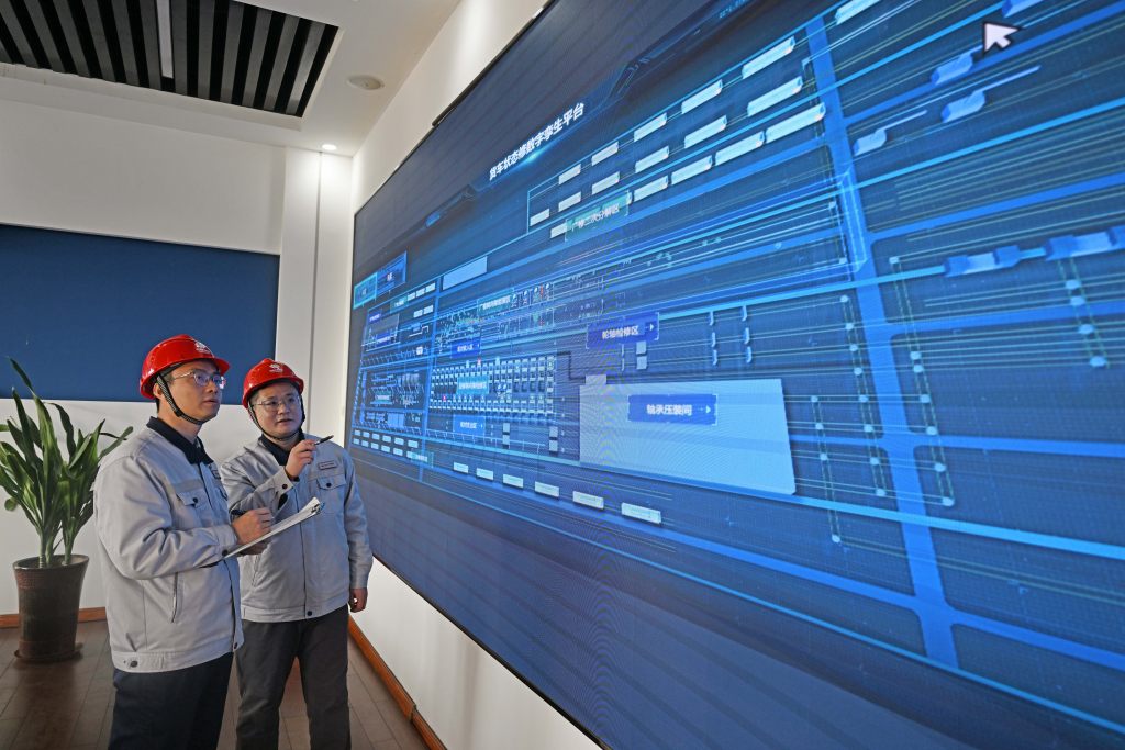 1月9日,冯乐乐(左)在查看智能运维状态修理系统数据。