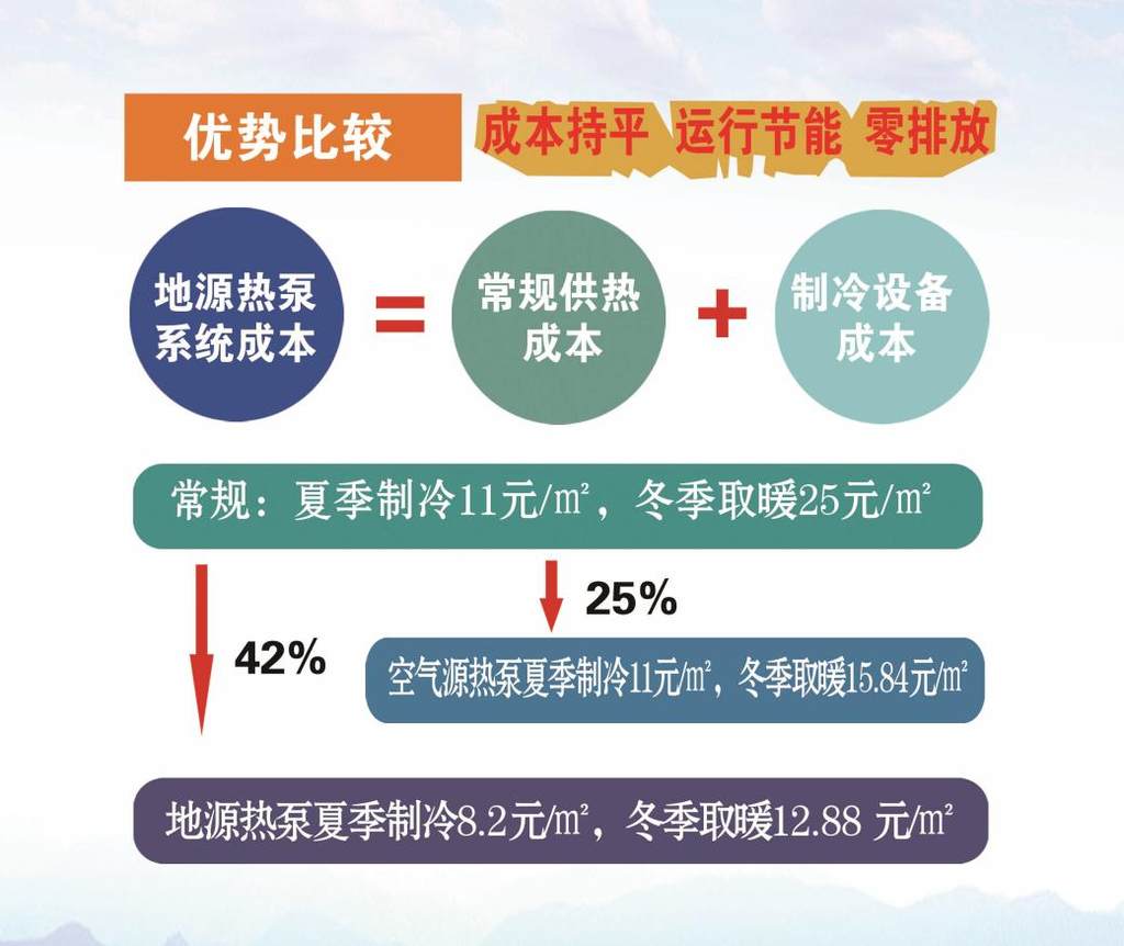这项被称为“21世纪绿色空调技术”的创新成果,利用浅层地热能可以实现冬季供暖、夏季制冷,比常规空调节能30%-40%。实测数据显示,其取暖费用仅为10-12元/平方米,远低于集中供暖的23元/平方米;制冷费用为2-8元/平方米,大幅低于家用空调的20元/平方米。