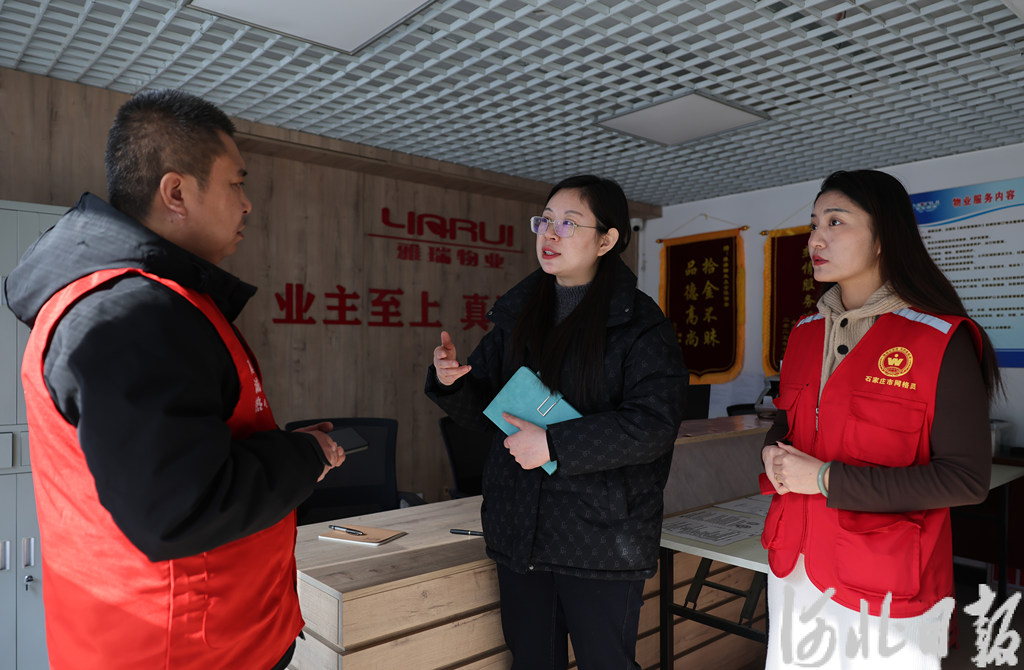 1月15日,在正定县三里屯街道社区物业公司,人大代表(中)和代表后援团成员(右一)与物业公司负责人协商解决小区电梯故障问题。 河北日报记者 霍相博摄