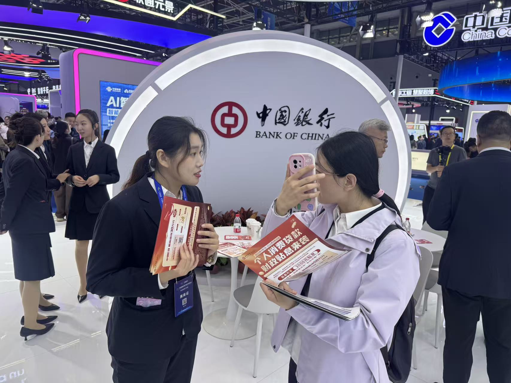 图为2025年数博会期间,河北中行工作人员向市民讲解个人消费贷款贴息政策。张潇予摄
