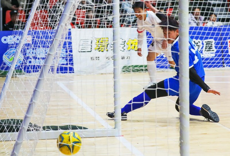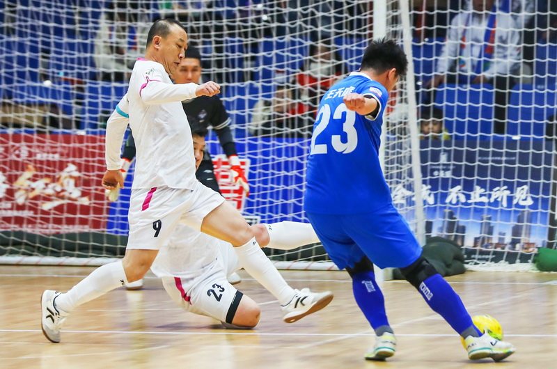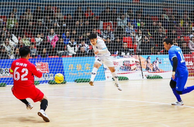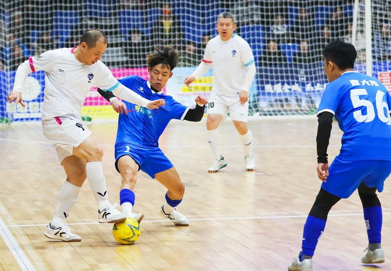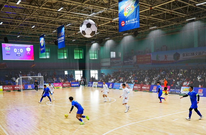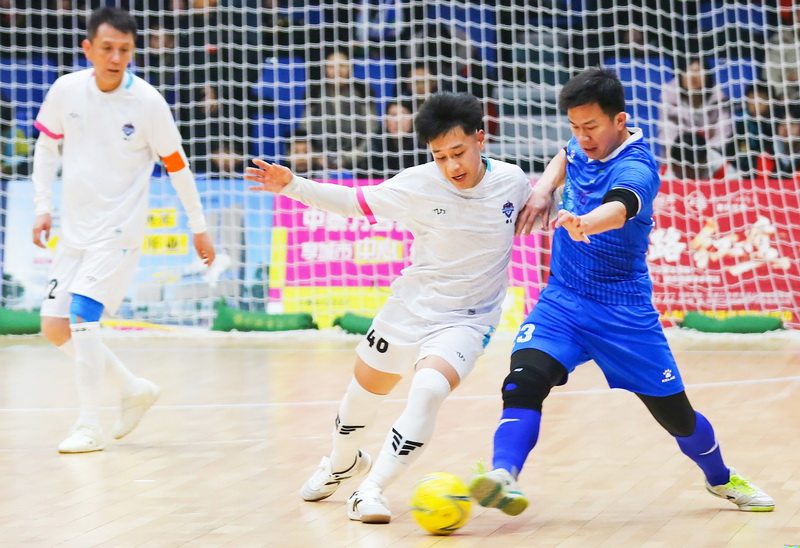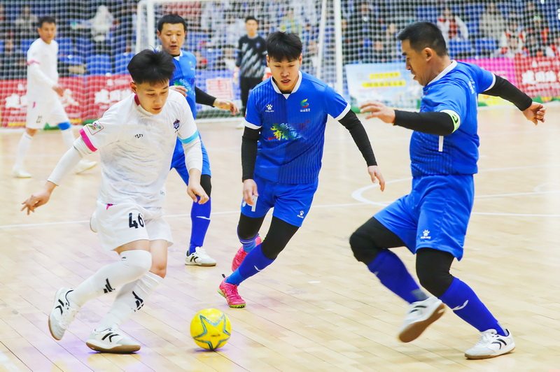1月17日,张家口市五人制足球超级联赛上,桥东队(白)与塞北队(蓝)在比赛中。