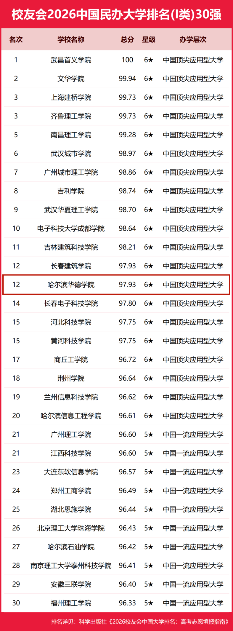 2026年1月12日,全国第三方大学评价研究机构艾瑞深校友会网(Cuaa.net)正式发布校友会2026中国大学排名。哈尔滨华德学院凭借卓越的办学实力和影响力,以总分97.93的优异成绩,荣登2026校友会排名第12名,获评中国顶尖应用型大学(6星)。省内同类院校工科类排名首位。在本次排名中,学校不仅较上一年度提升一名,更实现了连续六年稳居“校友会中国民办大学排名20强(I类)” 的里程碑式成就。这一喜人成绩,标志着学校综合办学实力再上新台阶。