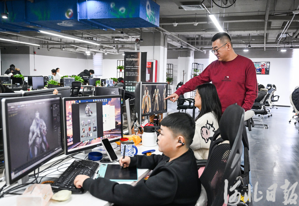 1月12日,张家口数字文创产业基地,北动漫(河北)网络科技有限公司员工在讨论人工智能项目细节。 河北日报记者 耿辉摄