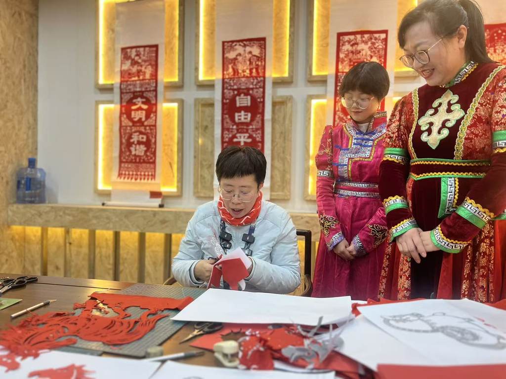 蒙曼体验非遗项目剪纸。