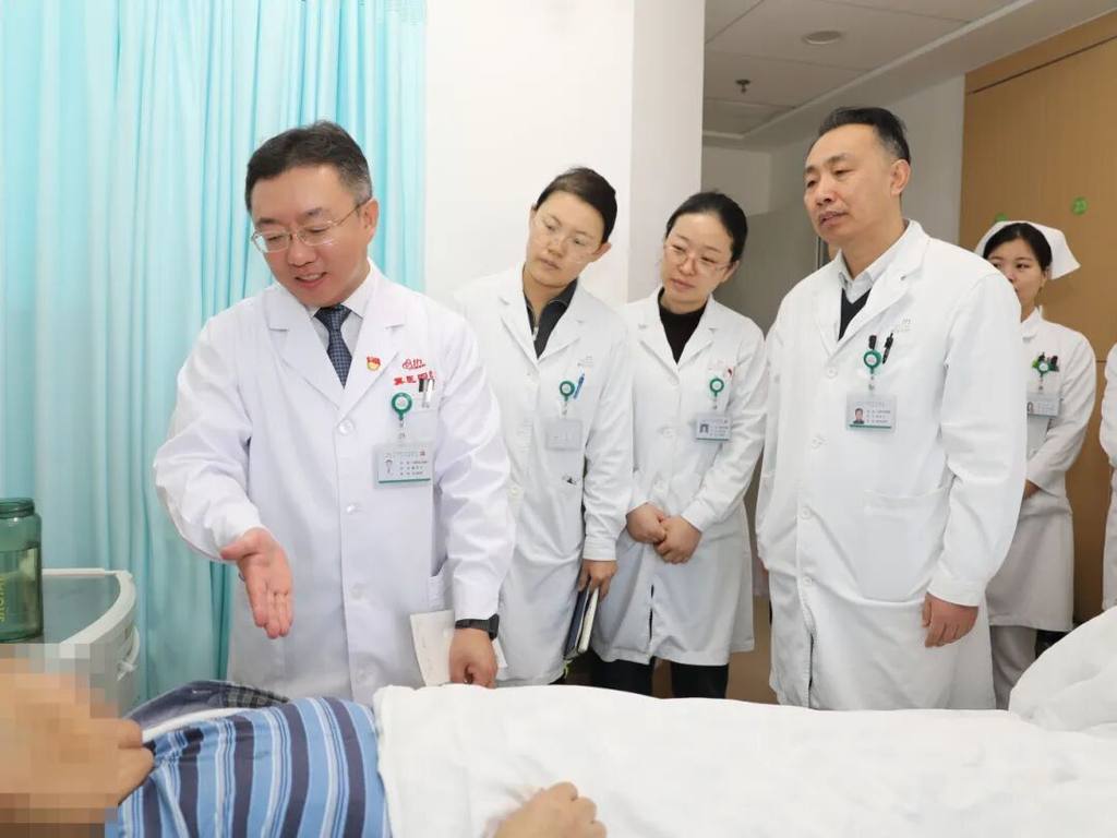 图为霍炳杰(左一)带领医护人员查房时,询问患者病情。河北医科大学第四医院供图