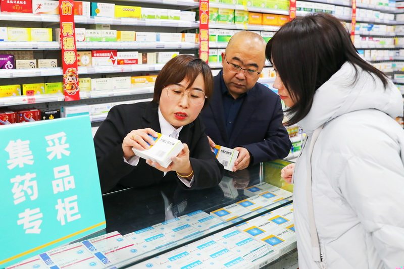 1月20日,张家口市桥东区医疗保障局工作人员(中)在药房了解集采药品销售情况。