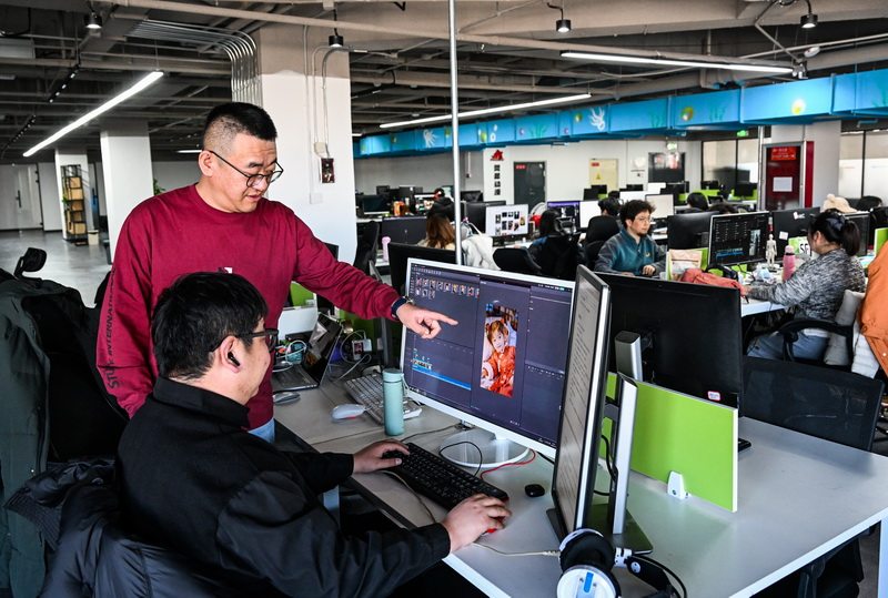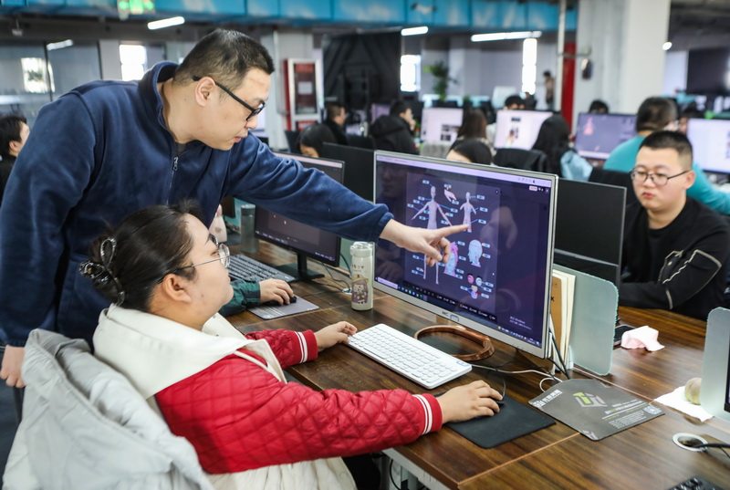 1月12日,张家口数字文创产业基地,北动漫(河北)网络科技有限公司员工在讨论项目细节。