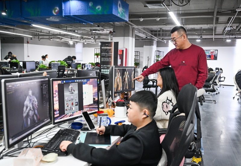 1月12日,游客在张家口数字文创产业基地的数字动漫研学基地体验动漫项目。