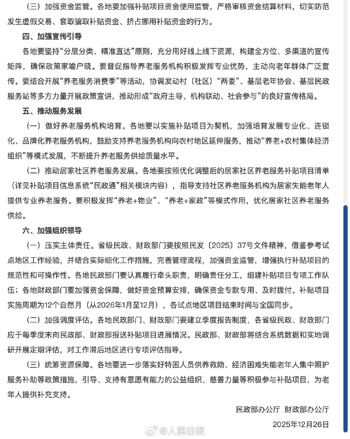 民政部要求,要强化监管,发挥综合监管作用,强化信息系统技防优势,确保惠民政策能够直达快享;强化服务监管,严格执行核查机制,要求基层民政部门按照不低于1%的比例进行实地核查,避免一销了之的情况。特别是要压实养老服务机构主体责任,对于敢于以身试险的要强化惩戒措施;强化评估监管。要严格执行国家标准和评估规范,做好互认共享。