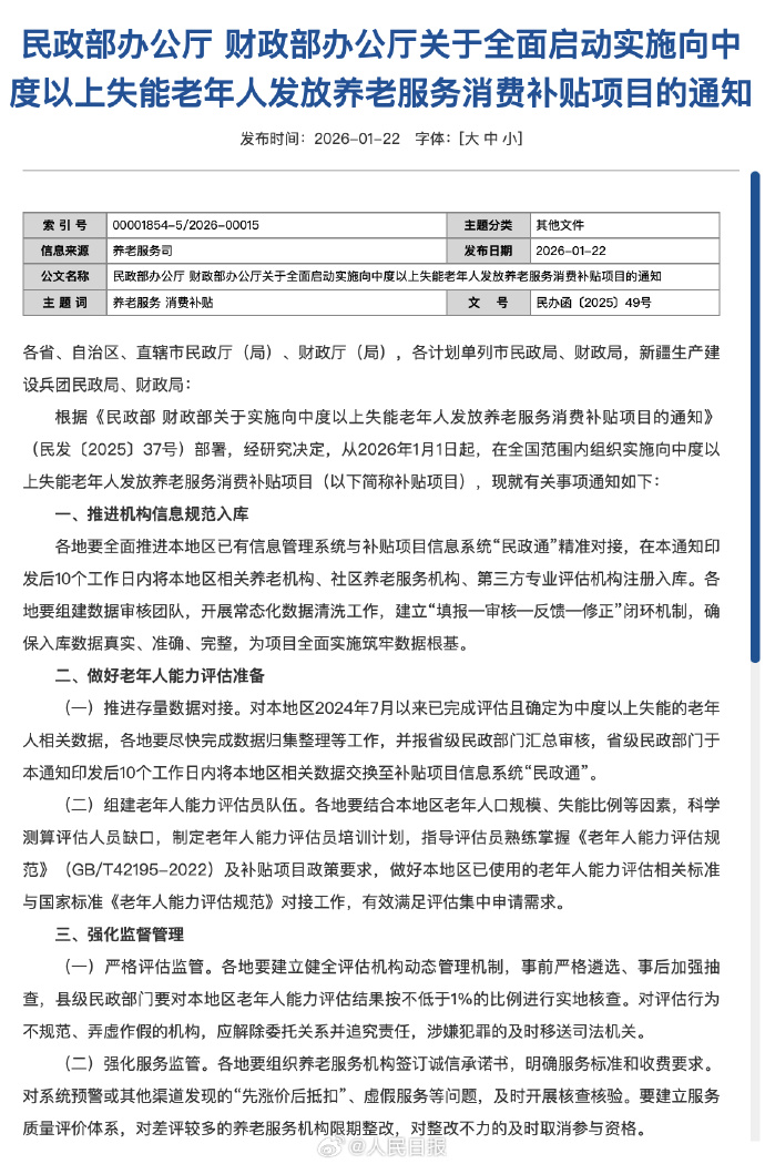 民政部、财政部日前印发通知,从今年1月1日起,面向中度以上失能老年人发放养老服务消费补贴的政策在全国正式实施。这一政策是在去年7月部分省市试点的基础上进一步全面推开。