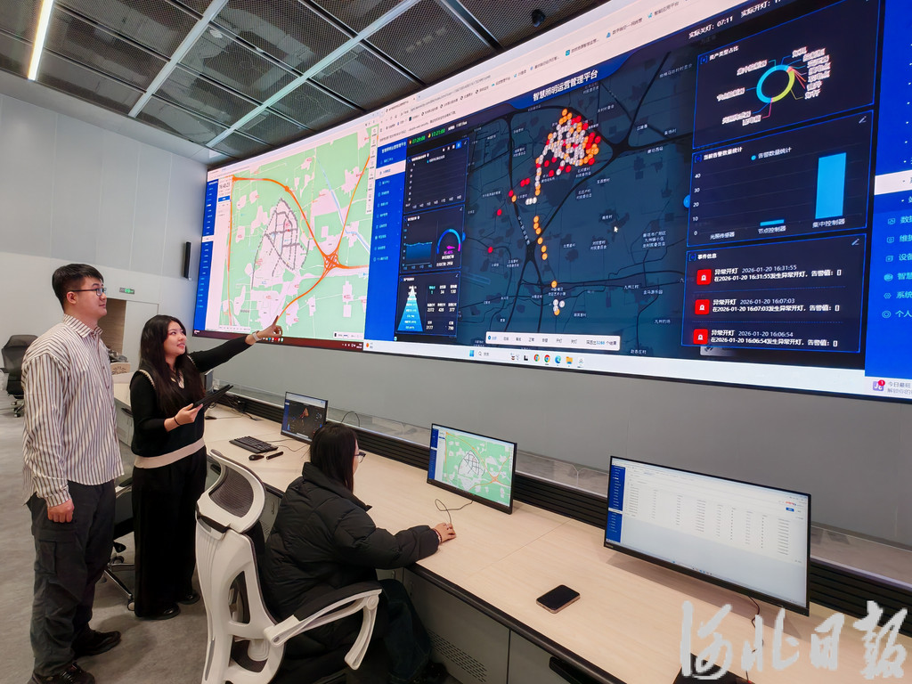 1月21日晚,在临空经济区(廊坊)数智城市运营中心,工作人员在智慧照明运营管理平台查看路灯运行状况。河北日报记者 刘杰摄
