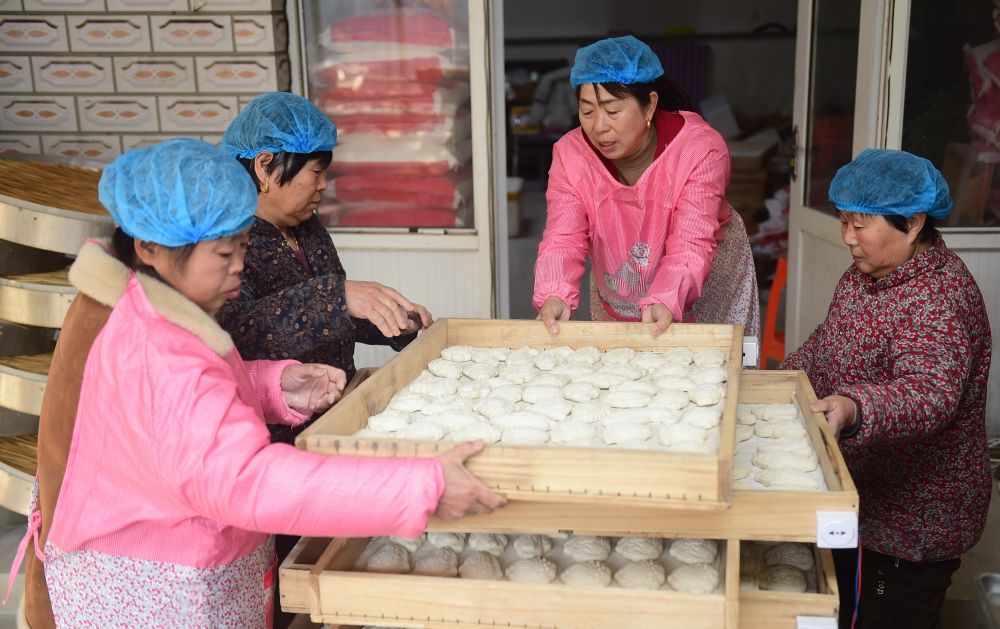 ↑1月22日,沧州市海兴县张常丰村一家面花作坊的工人在“晾花”。