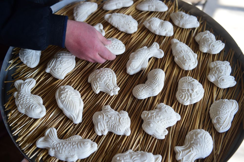 进入腊月,河北沧州部分乡村的面花作坊进入生产旺季,人们忙着制作各种形状的面花供应市场。面花是一种用模子塑形加工后蒸制的特色面食,有鱼、寿桃、十二生肖等造型,是当地春节期间的特色食品,经过揉面、搕花、晾花、蒸花等十多道工序制作而成。
