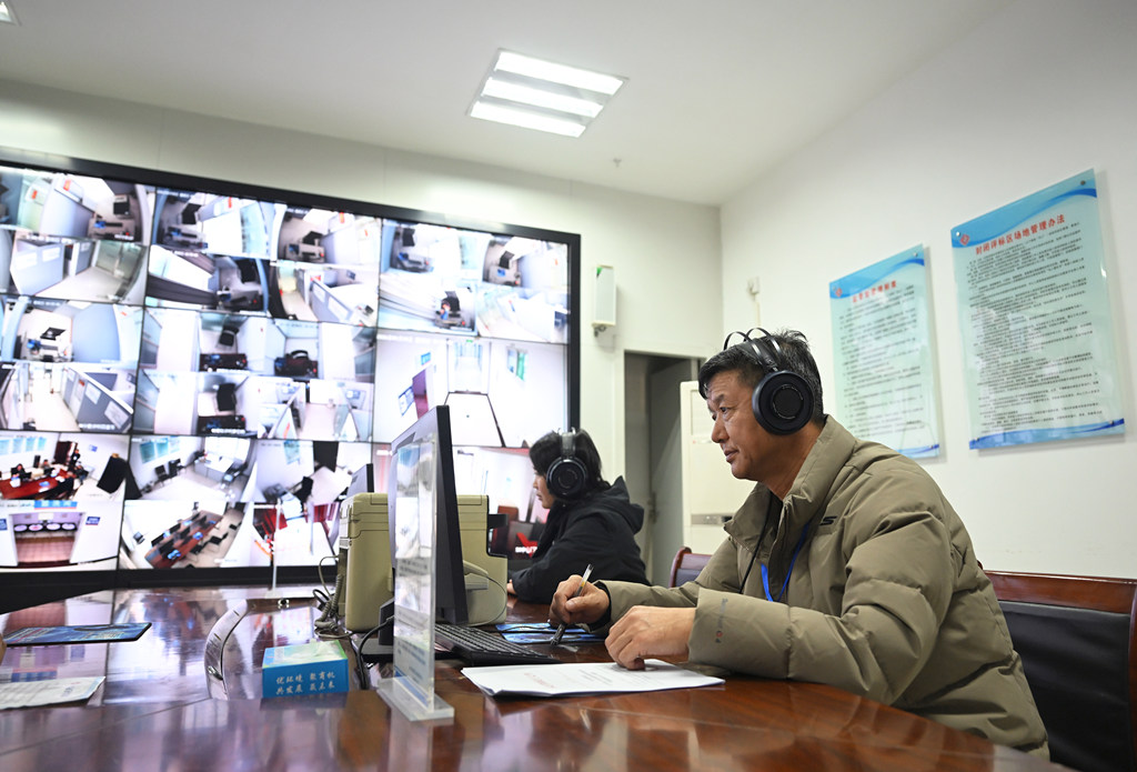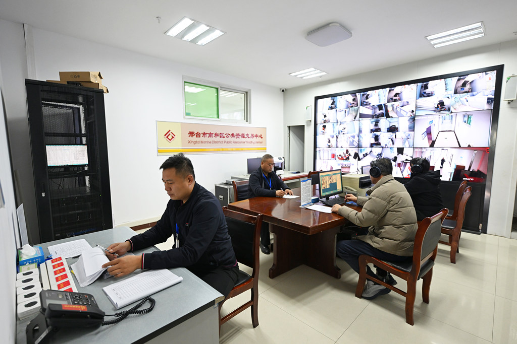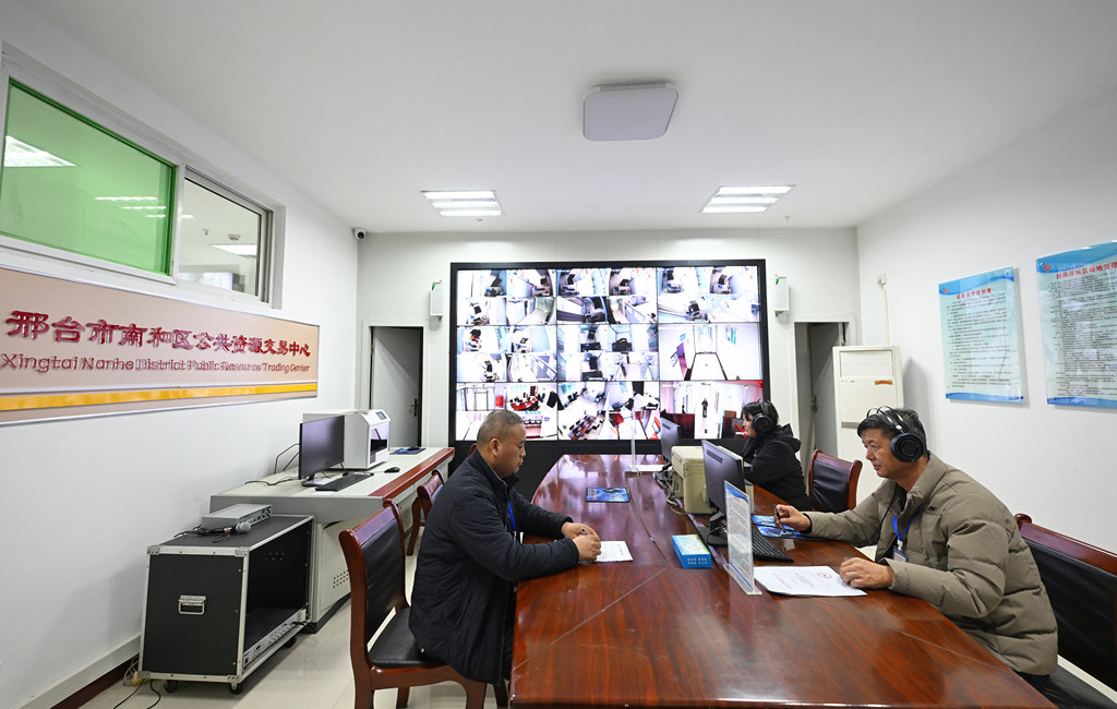 1月15日,在邢台市南和区公共资源交易中心,南和区财政局工作人员(右)在监督远程异地评标工作,确保“双盲”评审规范有序进行。