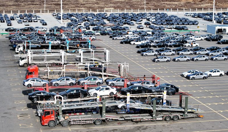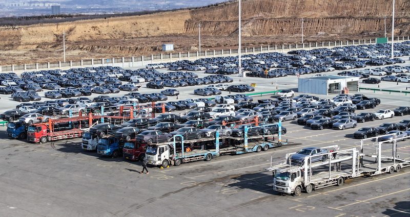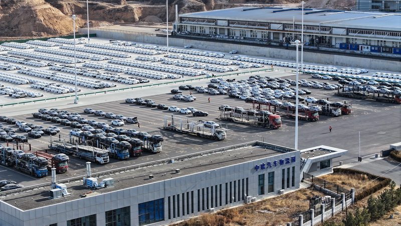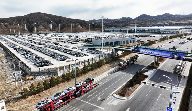 1月15日,张家口南山汽车产业基地中欧汽车物流园,工作人员将新能源汽车装车。