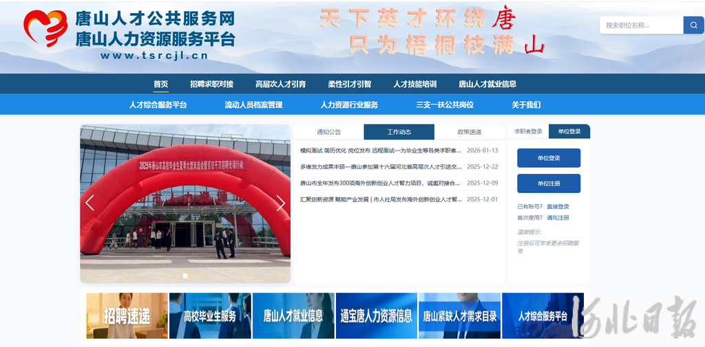 唐山人才公共服务网(唐山人力资源服务平台)网站页面。