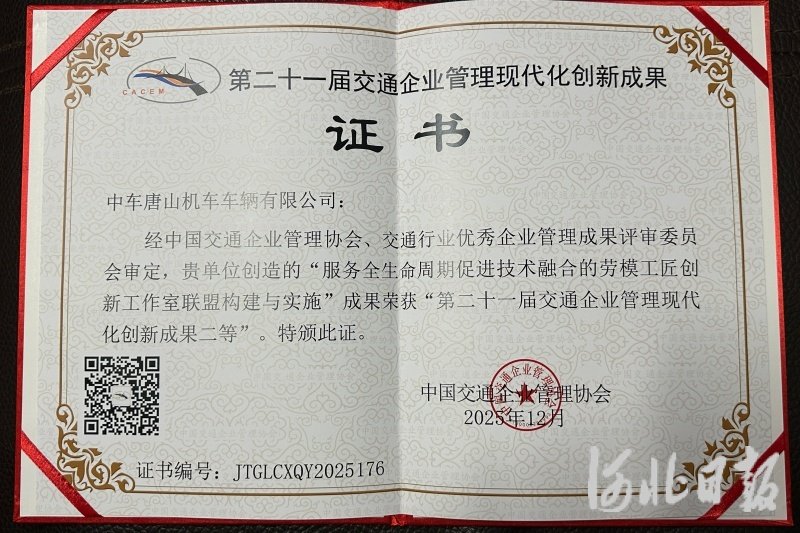 河北日报客户端讯(孙易安)近日,在中国交通企业管理协会主办的第二十一届交通企业管理创新成果发布会上,中车唐山机车车辆有限公司(以下简称“中车唐山公司”)工会申报的管理创新项目《服务全生命周期、促进技术融合的劳模工匠创新工作室联盟新模式建设》荣获交通企业管理创新成果二等奖。